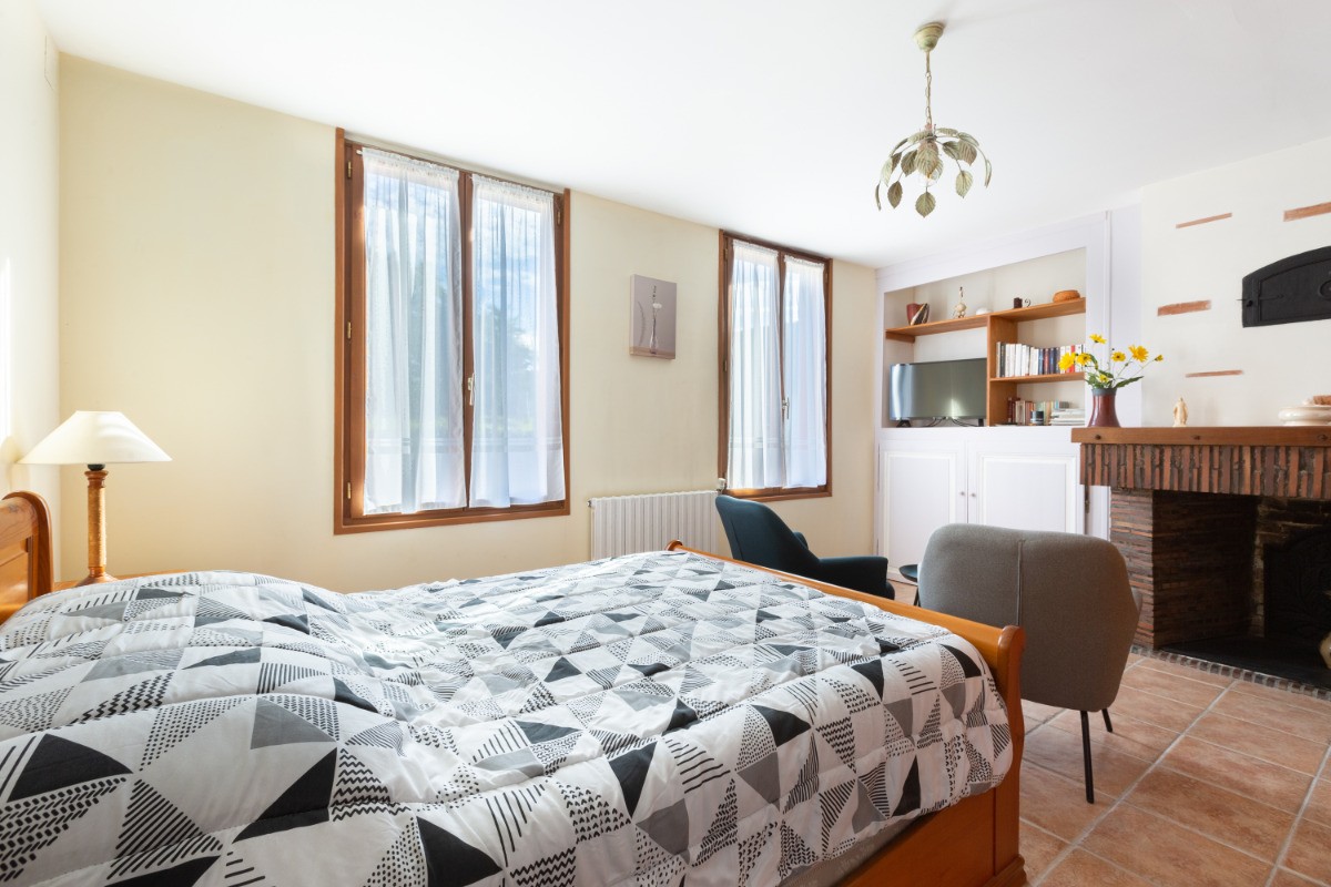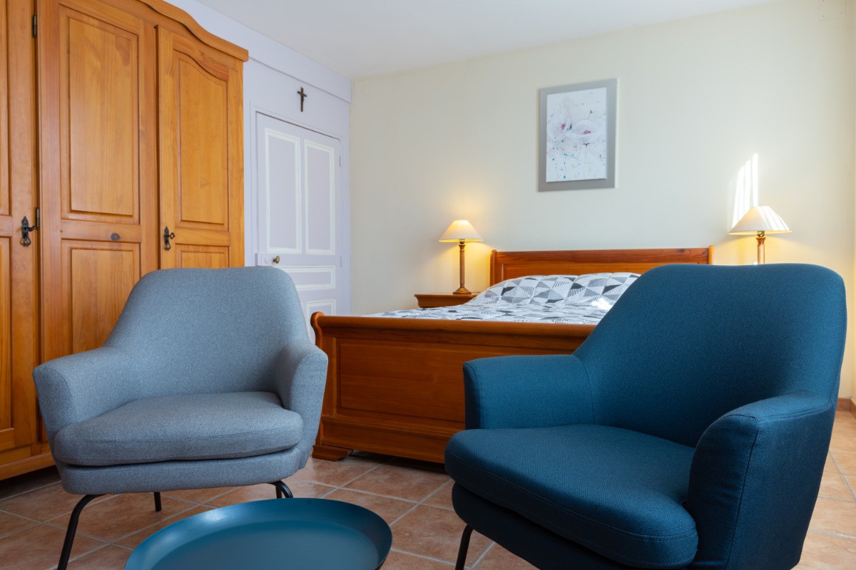> Bedroom with double bed (2 people): armchair, large TV, board games and books
