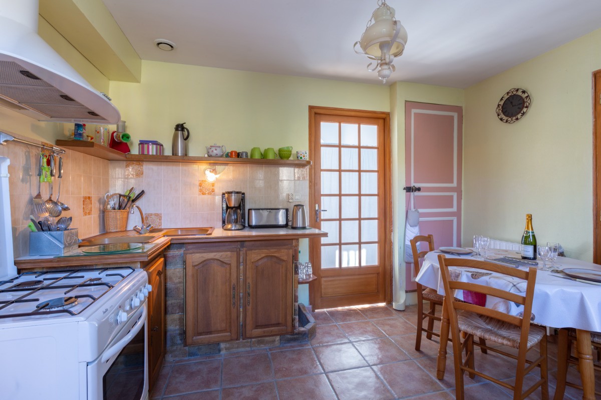 > Fully equipped kitchen: large oven, microwave, coffee maker, electric kettle, toaster