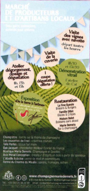 - visites du vignobles (départ en navette toutes les heures au domaine) et ateliers dosages, dégorgement et démonstration (à 11h, 13h ,15h)