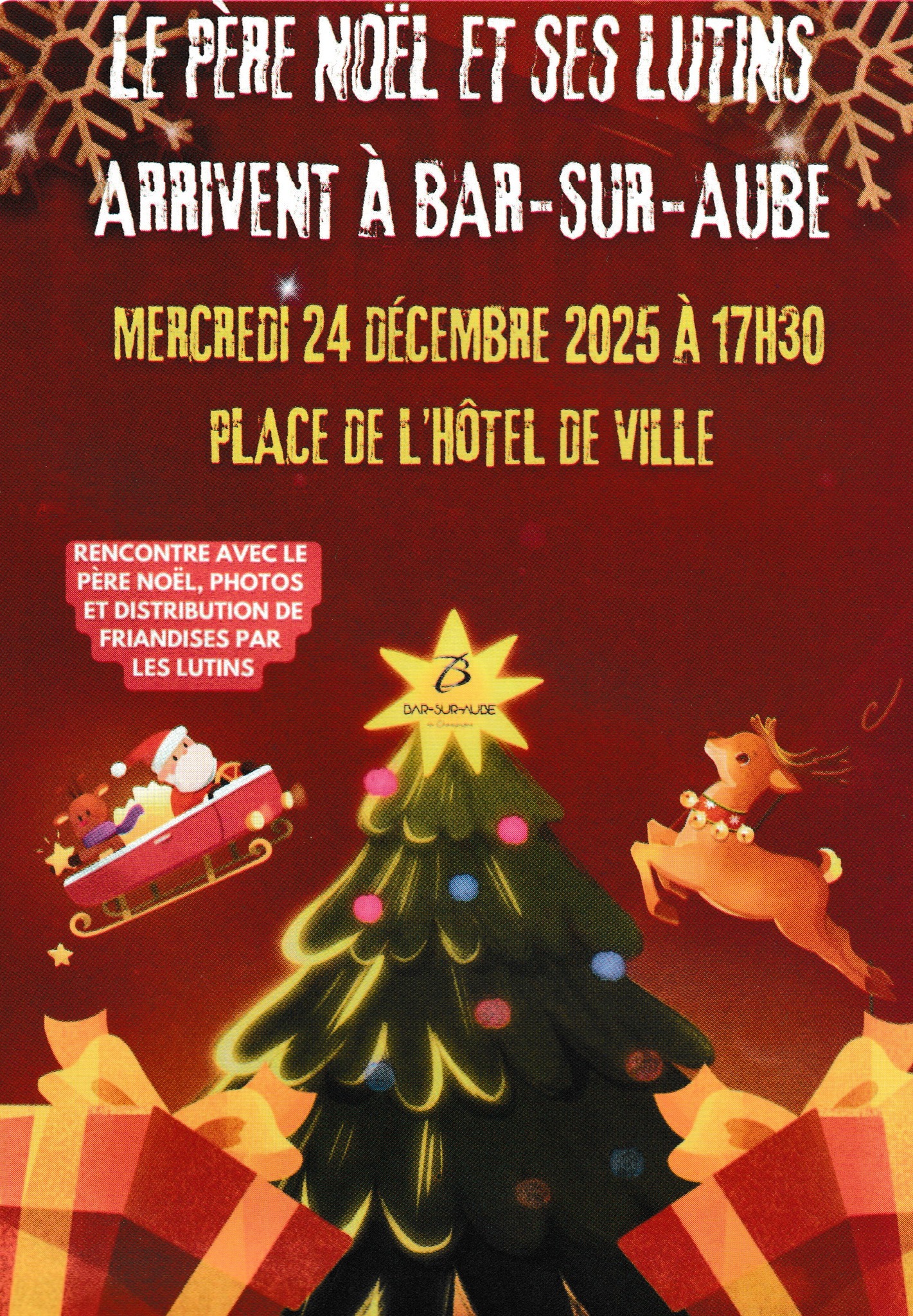 Juste avant sa grande tournée mondiale de distribution de cadeaux, le Père Noël sera de passage dans notre ville de Bar-sur-Aube le Mercredi 24 Décembre à partir de 17h30 sur la place de l'Hôtel de Ville.