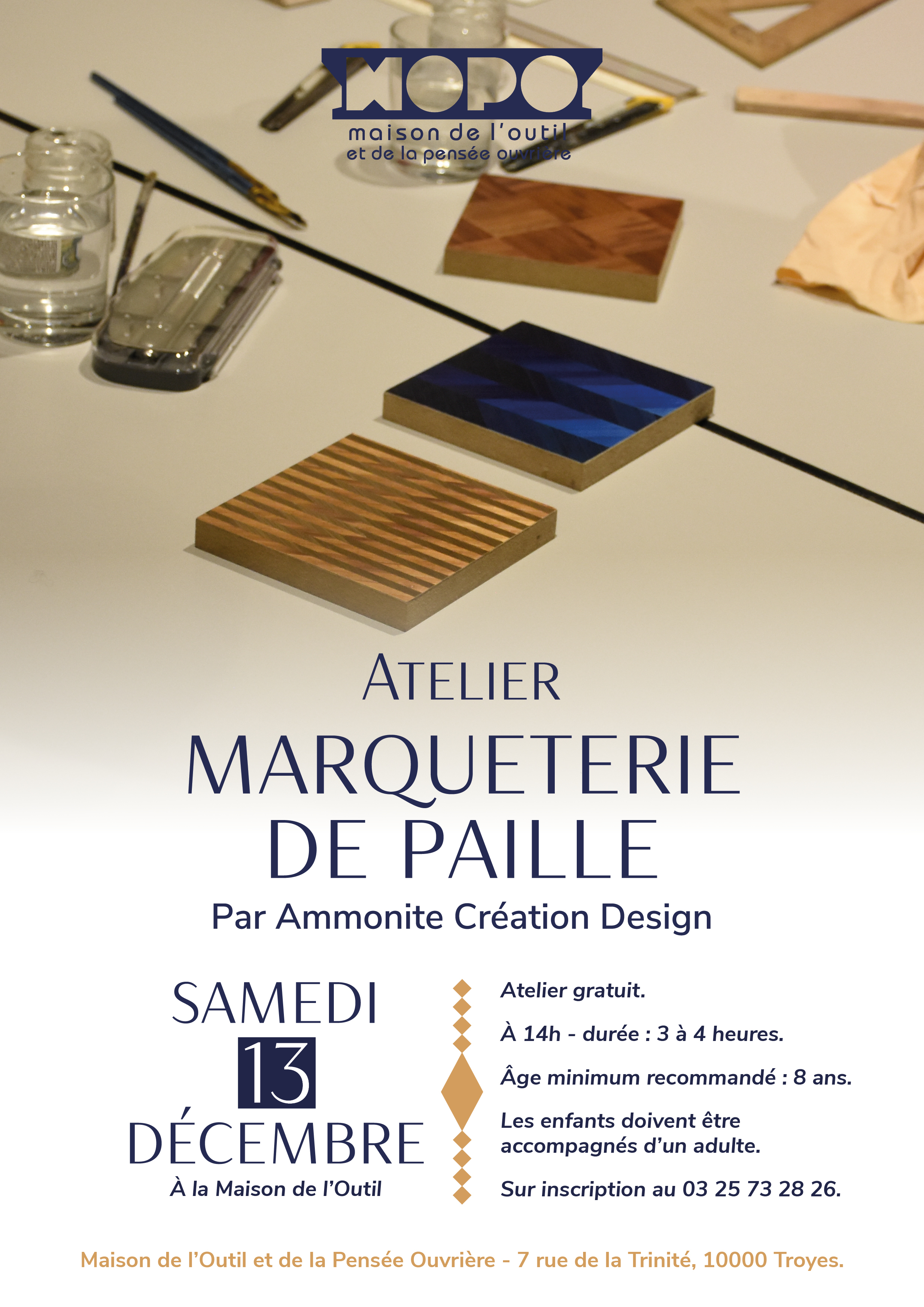 Cet atelier mené par Ammonite Création Design, permet à chaque participant de réaliser du début à la fin un panneau décoratif en marqueterie de paille, en choisissant un motif simple et élégant.
