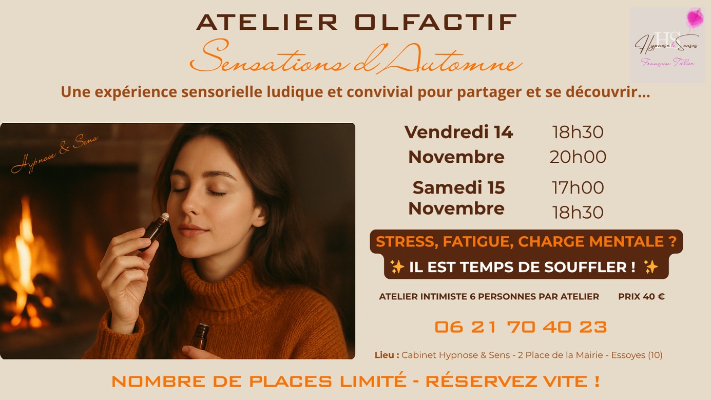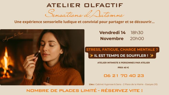 Limité à 6 participants par session pour garantir un accompagnement personnalisé, l'atelier se déroulera au cabinet Hypnose & Sens, situé 2 Place de la Mairie à Essoyes. Deux créneaux sont proposés : vendredi 14 novembre de 18h30 à 20h, et samedi 15 novembre de 17h à 18h30.