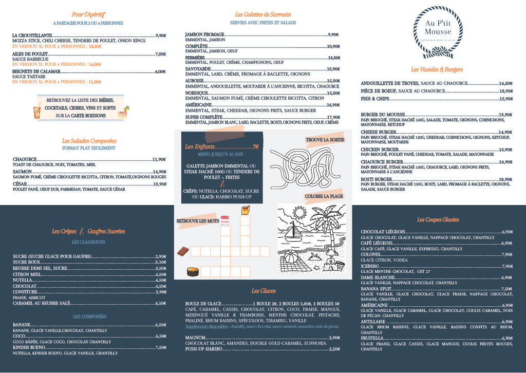 Au P’tit Mousse, c’est l’endroit idéal pour un déjeuner en famille, un goûter après la plage ou un dîner entre amis, dans un cadre convivial à l’esprit marin !
