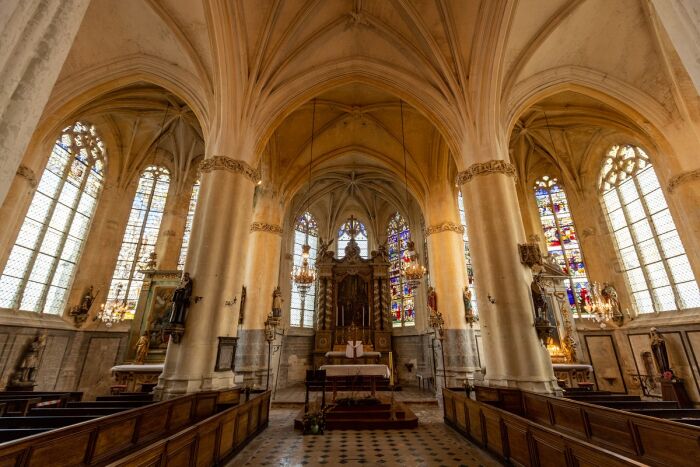 Curieusement c’est l’étude attentive de l’évolution des niveaux du sol qui donne les indications les plus précises sur les étapes de la construction de l’église Saint-Georges de Chavanges, (chef-lieu de canton du nord du département de l’Aube). Au point le plus élevé (donc le niveau le plus ancien) de ce rebord de la côte de Champagne, dominé par le clocher massif de la fin du 16e siècle subsiste à l’ouest, le vieux portail d’époque et de décoration romanes (fin 12e siècle). Un mètre et demi (7 marches) plus bas, on trouve le niveau établi au premier tiers du 16e siècle pour élever le chœur par un rabotage général et un prolongement de la butte à l’est. Entre les deux, la nef avait été reconstruite à la fin du 15e siècle, par la communauté paroissiale, dans un sobre style gothique tardif.Cette ouverture du terrain, mais aussi l’évolution du goût et la prospérité générale ont permis, un demi siècle plus tard, au frais du clergé et des familles nobles, comme c’est de règle dans la coutume de champagne, de déployer cet ample chœur et les deux bras du transept, dotés de trois absides à 4 et 5 pans. De larges baies assurent un éclairage de qualité. Les remplages, les piliers ondés, comme le décor de feuillage et de personnages pittoresques sur les chapiteaux en collerettes, appartiennent encore au gothique flamboyant.Le bâtiment achevé fut consacré en 1554 par Antonio Caracciolo, prince de Melphe. C’est ce fameux favori de Catherine de Médicis qui tenta d’être à la fois évêque de Troyes et pasteur de la communauté protestante.Le mobilier : statues, peintures et vitraux sont le reflet de ces étapes depuis les statues rustiques : une Vierge-mère, sainte Barbe, sainte Catherine ; les œuvres du 16e : saint Jean-Baptiste, saint Nicolas, saint-Georges, jusqu’à l’œuvre plus tardive : un Christ aux liens daté de 1702. .Les toiles méritent attention : Saint Sébastien, le Décollement de saint Georges, Sainte-Anne et la Vierge enfant, dispersées dans l’édifice, et celles des autels principaux : le Christ et les œuvres de miséricorde (1642), La Vierge donnant le rosaire à saint Dominique et sainte Catherine de Sienne (attribuée à Jaques de Létin, 1637) ; Saint Georges renversant les idoles (maitre autel daté de 1684) signée Jean Chabouillet. Les vitrauxUne belle série de verrières occupent les baies de la partie Est : on y retrouve les évolutions de l’art du vitrail en Champagne méridionale, qui tend vers un effacement des couleurs, et des modèles bien connus : dans le chœur, Nativité, Scènes de la Passion du Christ, l’Ascension ; la Création et la Vie de sainte Madeleine au sud ; la Vie de Saint André, la Sibylle de Tibur, et la Décollation de saint Jean-Baptiste au nord. Enfin, toujours au nord, la précieuse verrière de l’Apocalypse d’après la série de gravures du grand artiste allemand Albert Durer publiée en 1498. Même largement restaurée à la fin du 19e siècle, cette magnifique composition posée vers 1540, illustre la force des échanges commerciaux entre l’Allemagne et le royaume de France dans le premier tiers du 16e siècle. Le visiteur attentif peut y découvrir aussi la subtilité des maîtres verriers troyens dans l’art d’adapter leur modèle au goût des seigneurs (leurs armoiries sont encore visibles en haut) de ce terroir assez reculé de Champagne ; en l’occurrence ils faisaient preuve d’un goût assuré.Ouverte du lundi au dimanche.