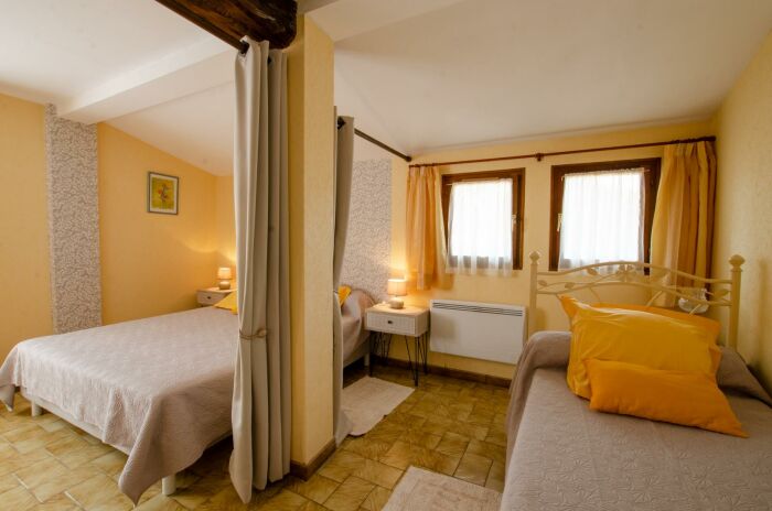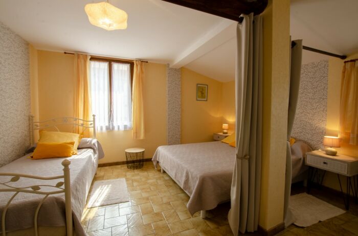 A votre disposition : séjour, salle à manger, cuisine aménagée (lave vaisselle, plaque à induction, frigo, congélateur), 1 chambre avec 1 lit double + 1 lit enfant et une chambre avec 2 lits simples de 90 + 1 lit double en 160. Salle d'eau (douche), WC. Chauffage électrique.