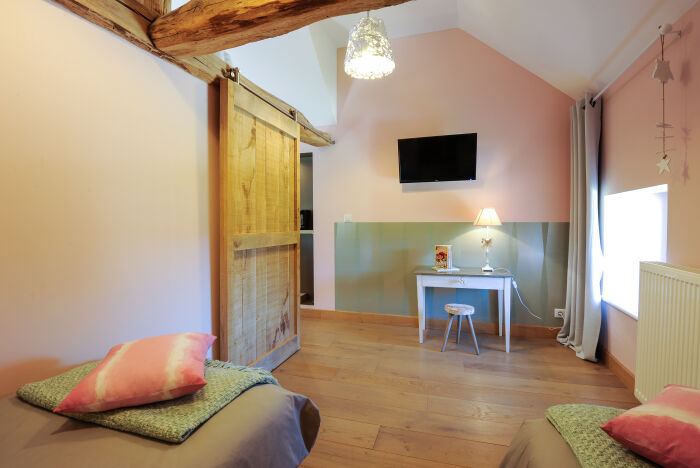 Corps de ferme rénové avec des matériaux de qualité, suite de charme décorée avec parquet en chêne massif vieilli. Plusieurs équipements sont à votre disposition (TV écrans plats, lecteur DVD, livres et DVD pour enfants, climatisation...) Cédric et Sophie vous proposent une terrasse, patio avec table et chaises en saison, jeu de pétanque, ping-pong, ... Les propriétaires vous aideront à découvrir la région (visites de caves, golf, parc d'attractions, randonnées, produits du terroir, restaurants...).