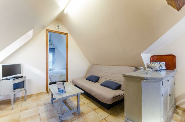 A l'étage d'une annexe de la maison des propriétaires, "Le Beauregard" (mitoyen à un autre appartement de 2 personnes) dispose d'une pièce de vie avec kitchenette, coin détente et coin repas avec TV écran plat et canapé convertible (possibilité de 2 couchages supplémentaires), d'une chambre double (lit 140x190) avec rangement et d'une salle de bain (baignoire, vasque et WC).