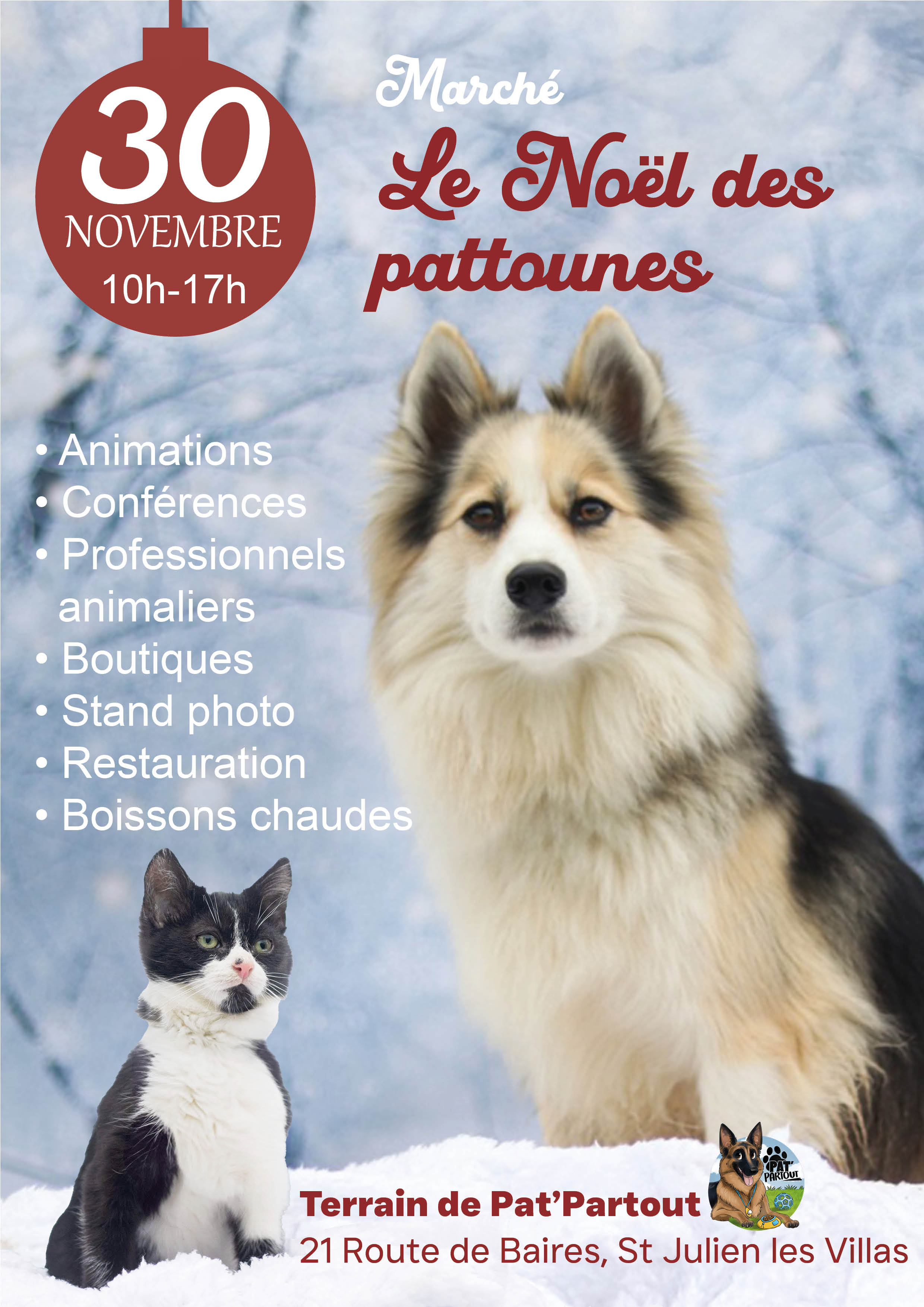 Bienvenue à notre deuxième édition du marché de Noël 100% chiens et chats ! Rdv le dimanche 30 Novembre 2025 de 10h à 17h, au terrain de Pat'Partout, 21 route de Baires, 10800 Saint-Julien-les-Villas !