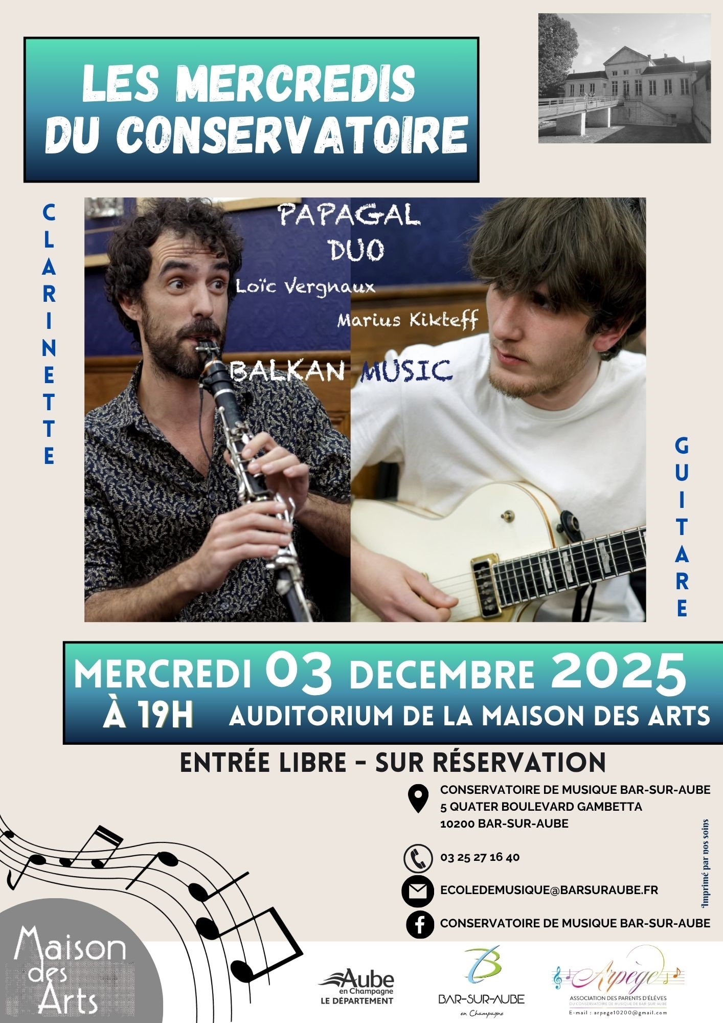 Les mercredis du conservatoire sont de retour avec un concert de musique des balkans par Papagal Duo le Mercredi 3 Décembre à 19h à l'auditorium de la maison des arts.