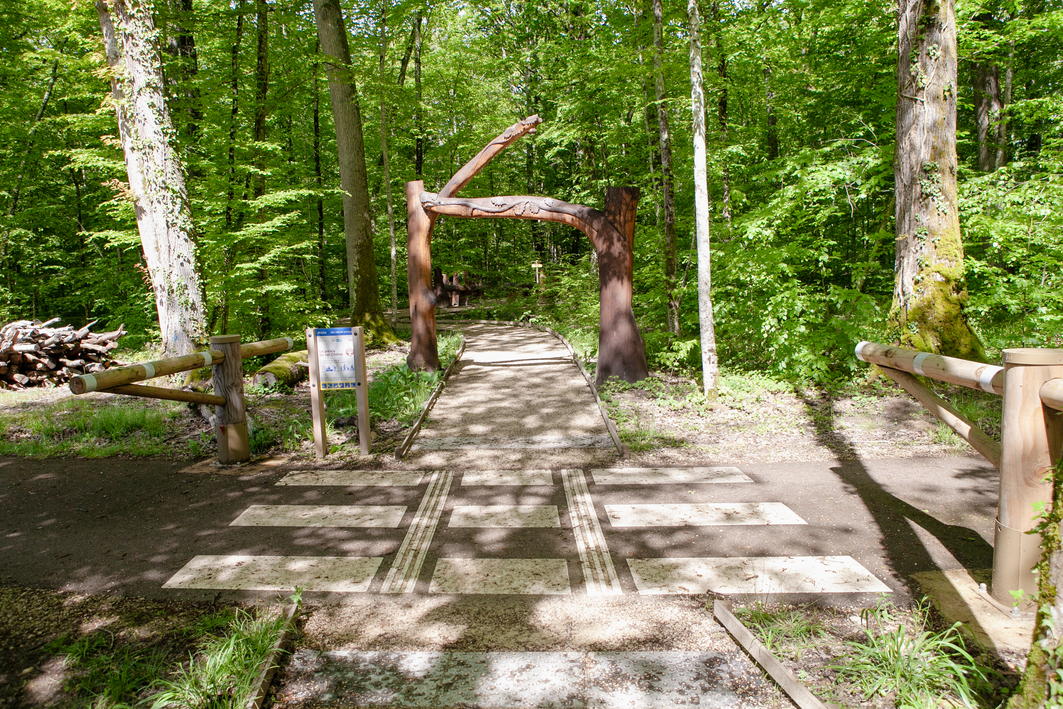 Mobilité : Parcours en boucle d'environ 800 m sur le Sentier du Palais du Roi Chêne, accessible aux personnes à mobilité réduite (PMR). Proximité immédiate du parking et des sanitaires accessibles de la Maison du Parc.