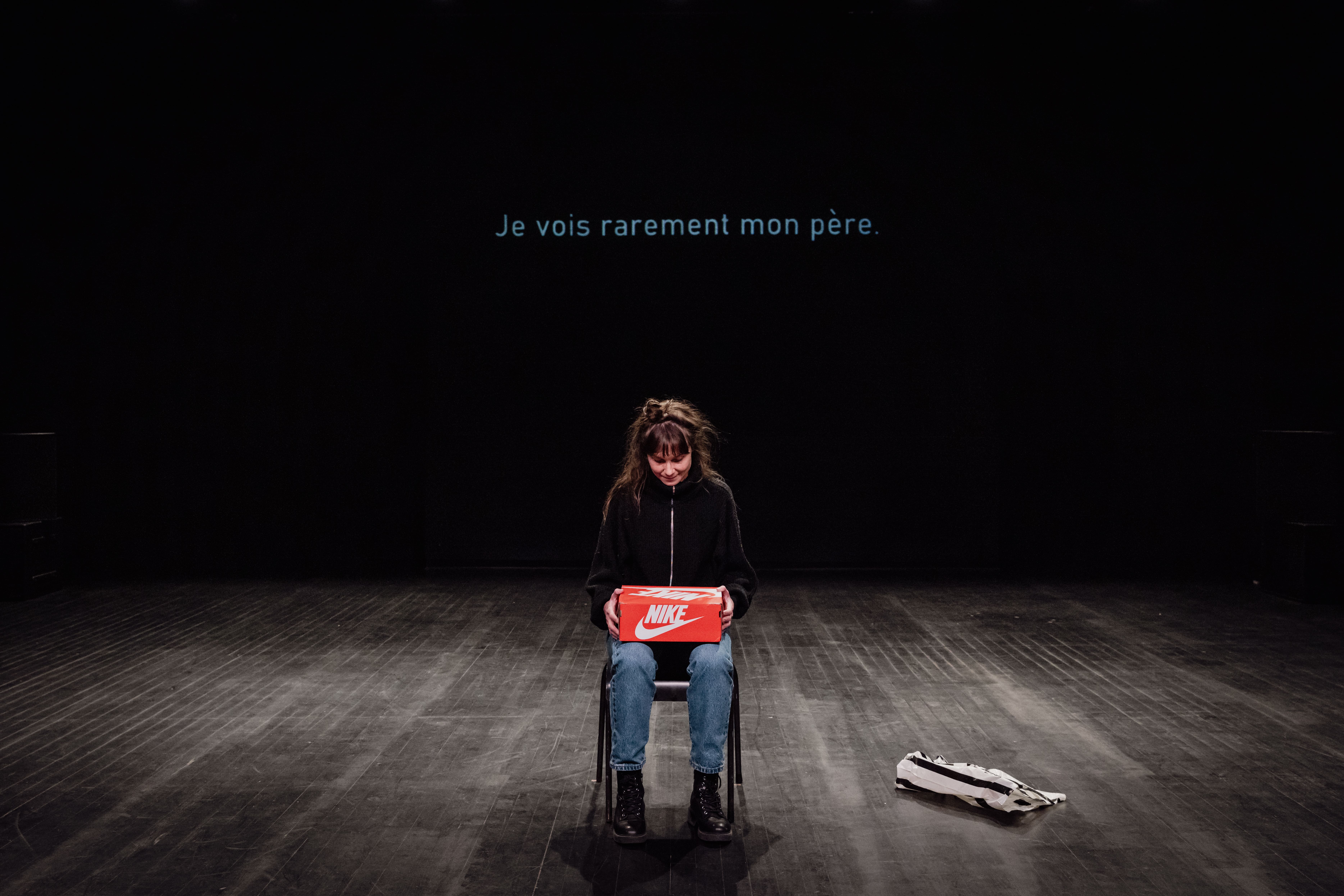 Sur un plateau nu, occupé d’une seule chaise – que le personnage va déplacer au gré de ses prises de parole – et d’un micro, Victoria Quesnel porte avec une énergie féroce la parole de Constance Debré, traversant tous les registres de jeu. Soit une parole lapidaire, sèche, abrasive. Nourrie d’un anticonformisme impitoyable, d’un rejet de toutes les conventions, cette parole détaille la relation de la fille à son père, sa sœur et ses amours.