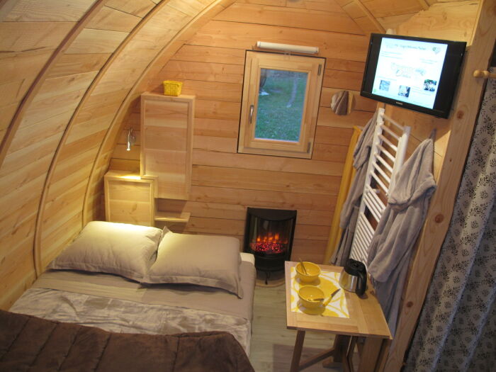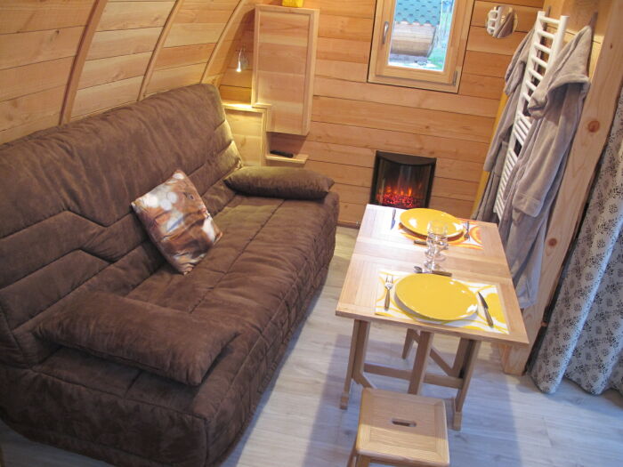 Notre Cabane Cosy de 15 m² "LA POM DE PIN" comprend une pièce de vie composée d'un espace cuisine équipé, d'une confortable banquette lit en 140 x 200 avec TV écran plat, wifi et poële électrique.