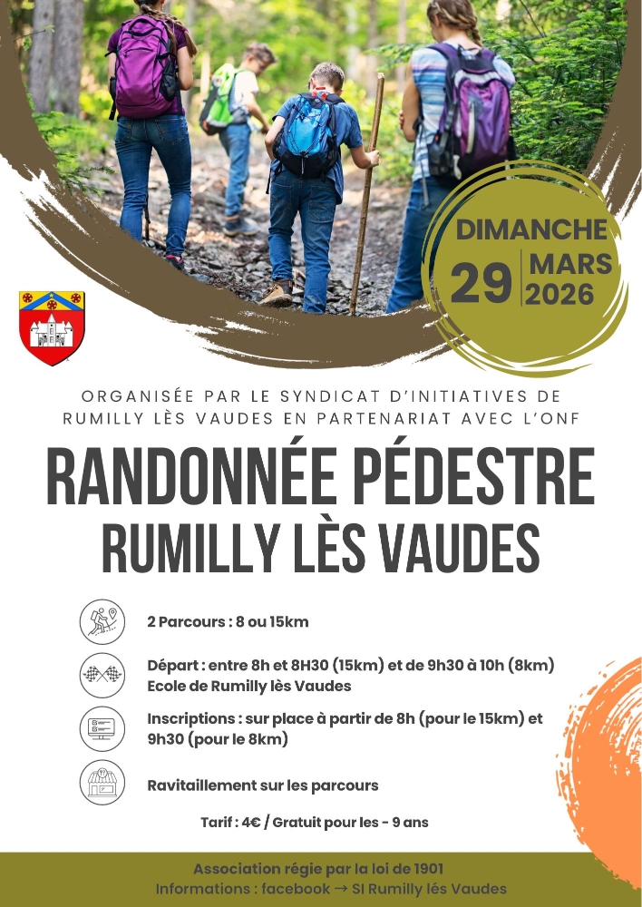 Le Syndicat d'Initiative de Rumilly-les-Vaudes en partenariat avec l'ONF organise une randonnée pédestre le Dimanche 29 Mars au départ de l'école de Rumilly.
