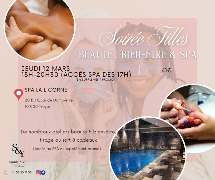 Envie de prendre soin de vous en faisant plein de découvertes dans une ambiance conviviale les filles ? Sandy vous attend le jeudi 12 mars de 18h à 20h30, au SPA La Licorne, pour vous y proposer 2h30 d'ateliers beauté & bien-être !