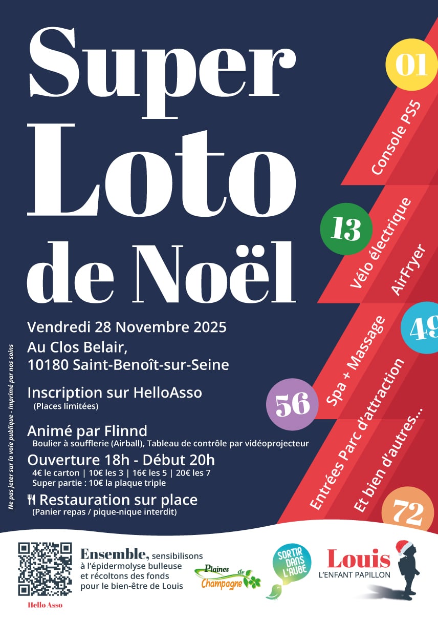 Super Loto de Noël – Louis l’Enfant Papillon Venez passer une soirée conviviale et solidaire au profit de l’association Louis l’Enfant Papillon !