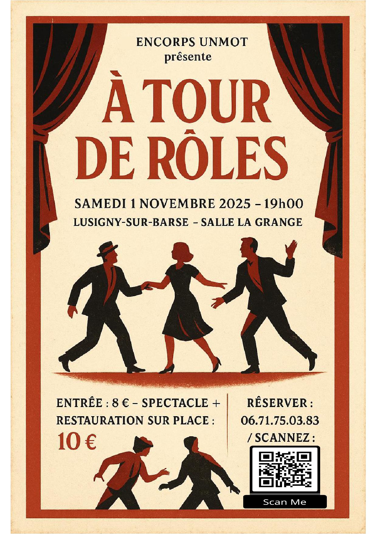 Entre textes classiques et répliques cultes, émotion et humour, « À tour de rôles » promet une soirée pétillante, portée par une troupe pleine d’énergie et d’enthousiasme. Alors, préparez vos zygomatiques et laissez-vous embarquer dans ce tourbillon théâtral signé Encorps Unmot !